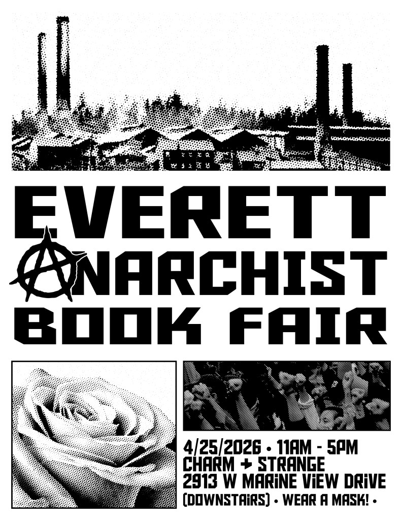 I am realizing now that I don’t actually know what happens at an Anarchist Book Fair, but I am very excited to find out. We are thrilled to be able to stack these events like the smokestacks of old Everett. (That sounded WAAAY cooler in my head.)